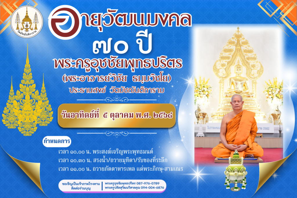 ขอเชิญร่วมงานมุทิตาสักการะอายุวัฒนมงคล ๗๐ วัสสา พระครูอุชชัยพุทธปริตร (วิชัย ธมฺมวิชโย) ประธานสงฆ์วัดมัชฌันติการาม ณ ศาลาปฏิบัติธรรมวัดมัชฌันติการาม