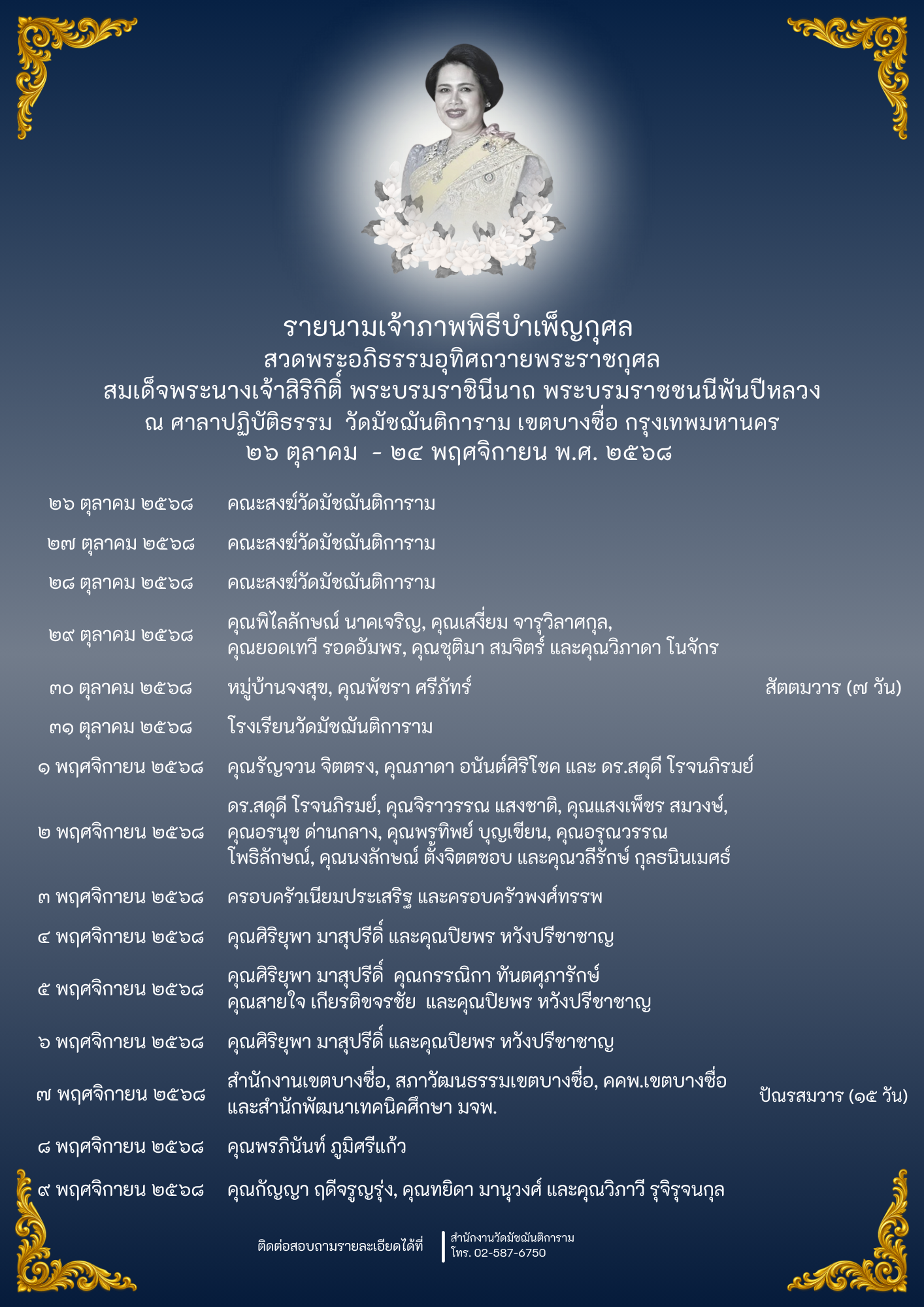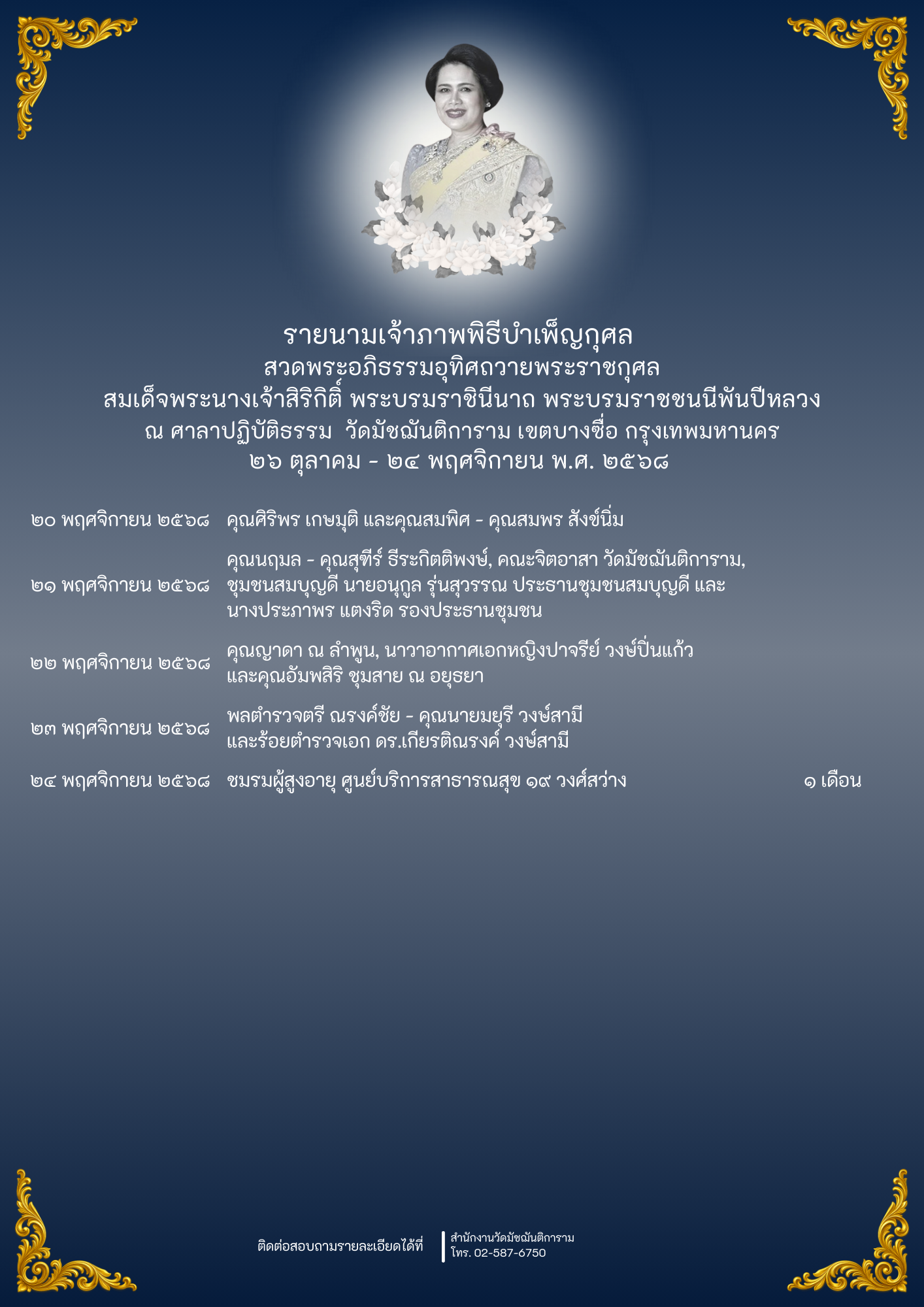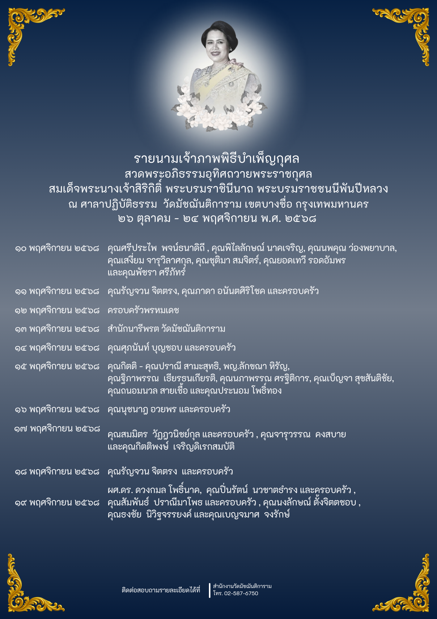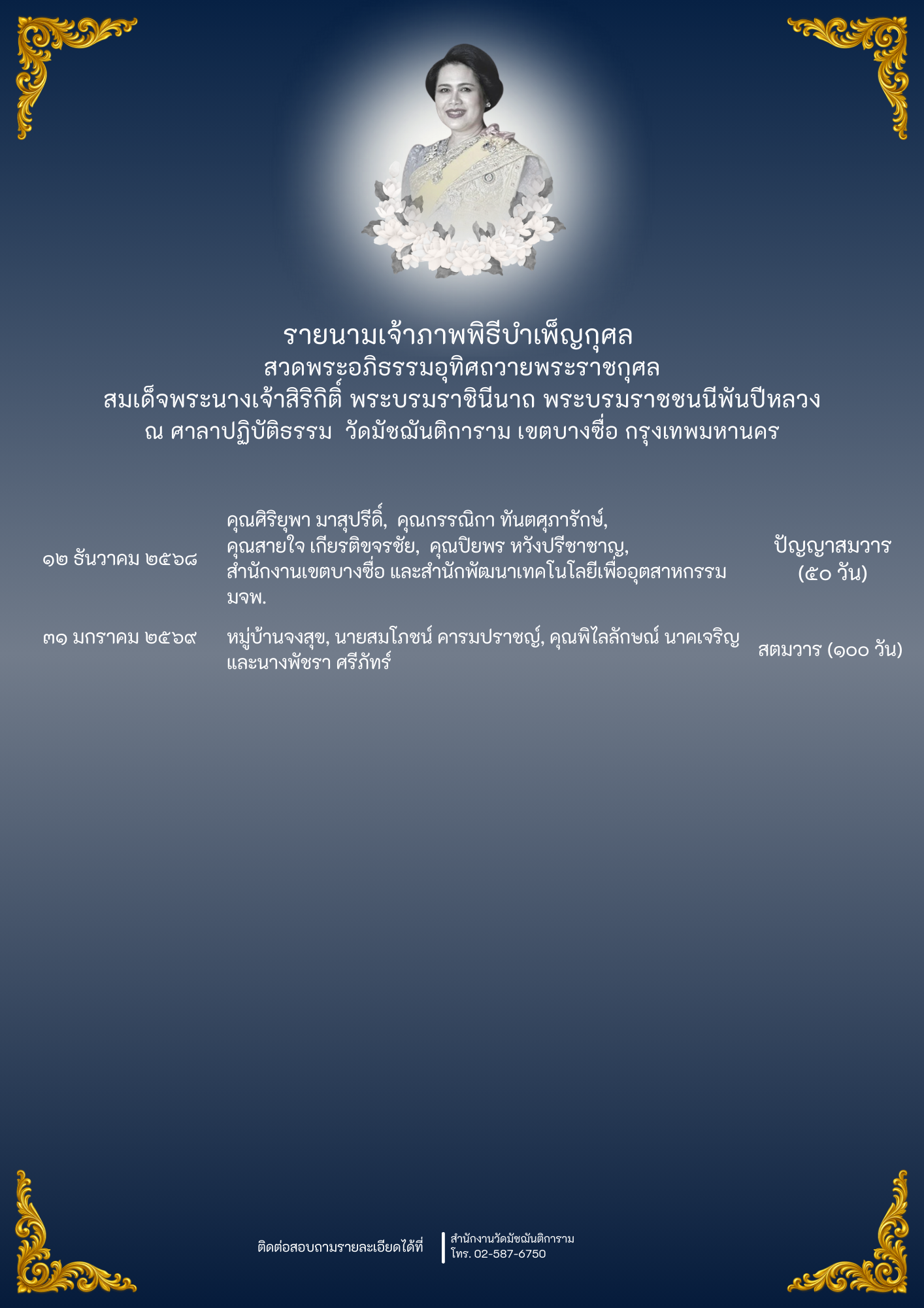 รายนามเจ้าภาพ พิธีบำเพ็ญกุศล สวดพระอภิธรรมอุทิศถวายพระราชกุศล สมเด็จพระนางเจ้าสิริกิติ์ พระบรมราชินีนาถ พระบรมราชชนนีพันปีหลวง ณ ศาลาปฏิบัติธรรม วัดมัชฌันติการาม เขตบางซื่อ กรุงเทพมหานครข่าวประกาศแนวตั้ง / By Siridharo_webmaster
