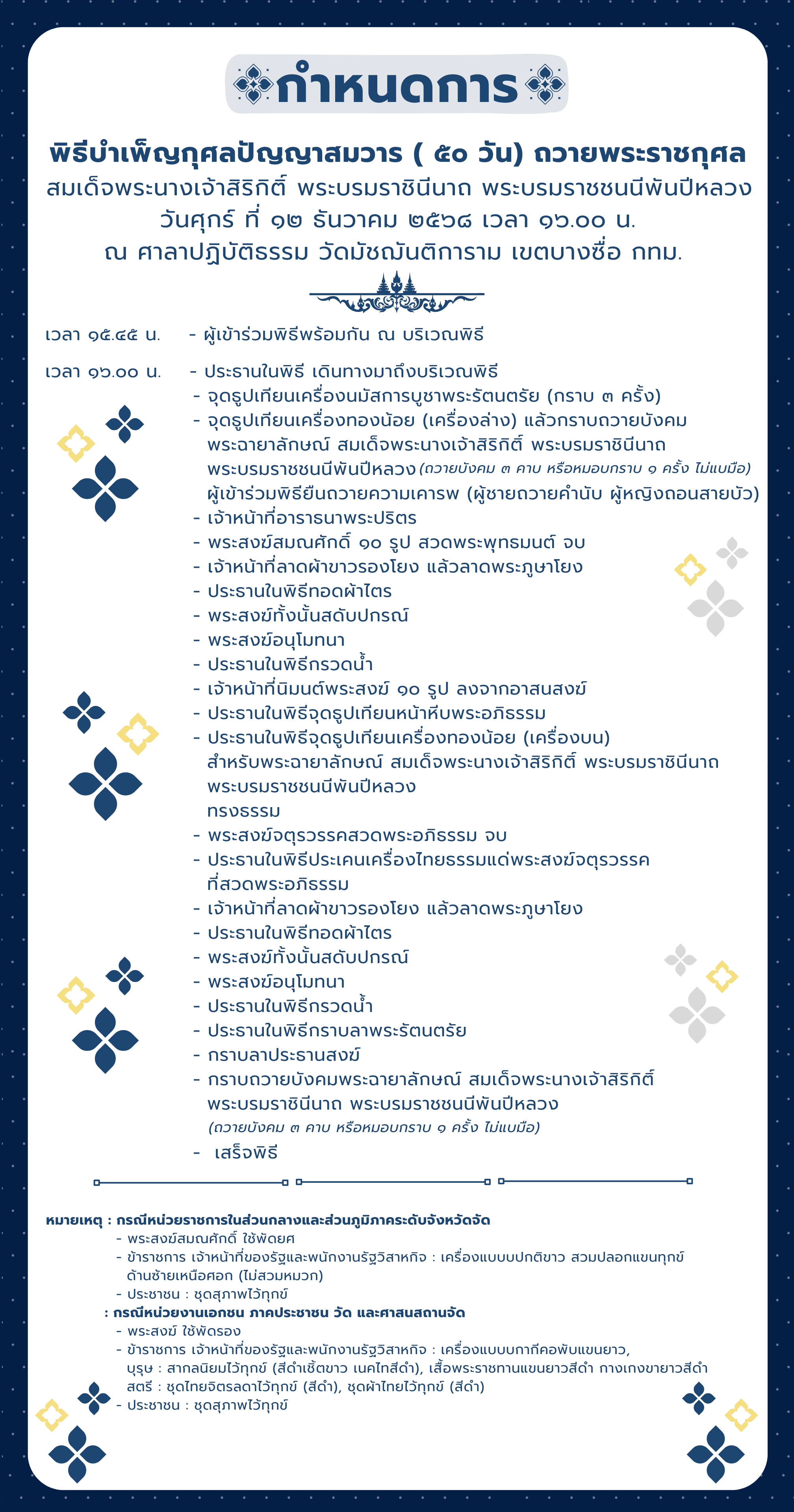 ขอเชิญร่วมพิธีบำเพ็ญกุศล ปัญญาสมวาร (๕๐ วัน) อุทิศถวายพระราชกุศลแด่ สมเด็จพระนางเจ้าสิริกิติ์ พระบรมราชินีนาถ พระบรมราชชนนีพันปีหลวงข่าวประกาศ / By Siridharo_webmaster
