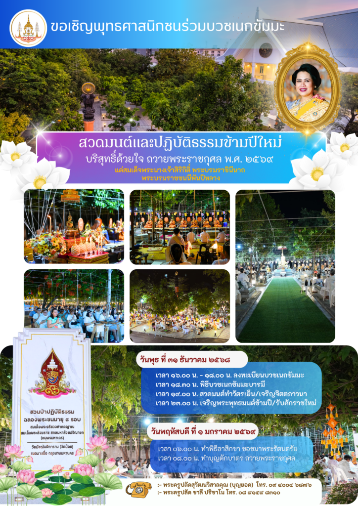 ขอเชิญชวนพุทธศาสนิกชน และผู้มีจิตศรัทธาทุกท่าน ร่วมทำบุญถวายผ้าพระกฐินพระราชทาน วันอาทิตย์ที่ ๑๒ ตุลาคม พ.ศ. ๒๕๖๘ เวลา ๐๙.๓๙ น.